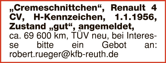 zurück zur Übersicht Veröffentlicht am 31.08.2024 „Cremeschnittchen“, Renault 4 CV, H-Kennzeichen, 1.1.1956, Zustand „gut“, angemeldet, ca. 69 600 km, TÜV neu, bei Interesse bitte ein Gebot an: robert.rueger@kfb-reuth.de