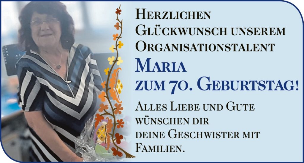 zurück zur Übersicht Veröffentlicht am 20.09.2025 Herzlichen Glückwunsch unserem Organisationstalent Maria zum 70. Geburtstag! Alles Liebe und Gute wünschen dir deine Geschwister mit Familien.