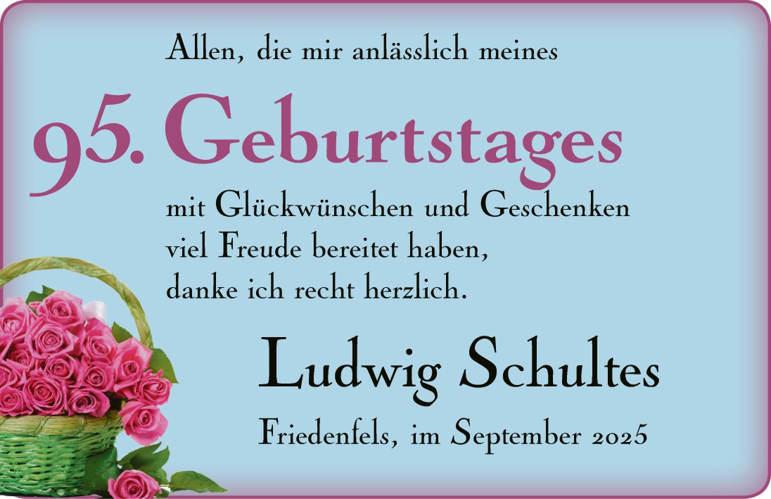zurück zur Übersicht Veröffentlicht am 01.10.2025 Allen, die mir anlässlich meines 95. Geburtstages mit Glückwünschen und Geschenken viele Freude bereitet haben, danke ich recht herzlich. Ludwig Schultes Friedenfels, im September 2025