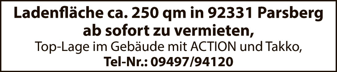 zurück zur Übersicht Veröffentlicht am 29.11.2025 Ladenfläche ca. 250 qm in 92331 Parsberg ab sofort zu vermieten, Top-Lage im Gebäude mit ACTION und Takko, Tel-Nr.: 09497/94120