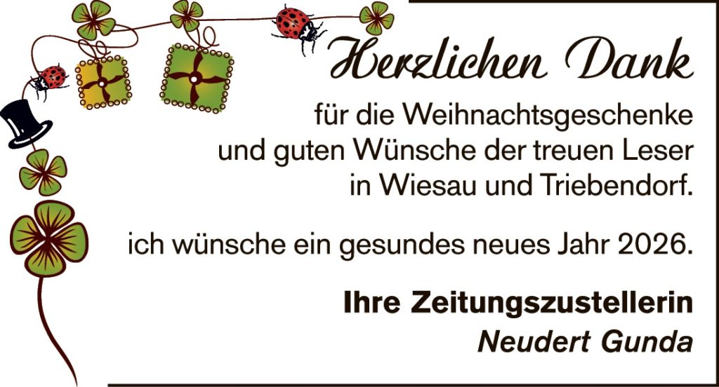 zurück zur Übersicht Veröffentlicht am 31.12.2025 Herzlichen Dank für die Weihnachtsgeschenke und guten Wünsche der treuen Leser in Wiesau und Triebendorf ich wünsche ein gesundes neues Jahr 2026 Ihre Zeitungszustellerin Neudert Gunda