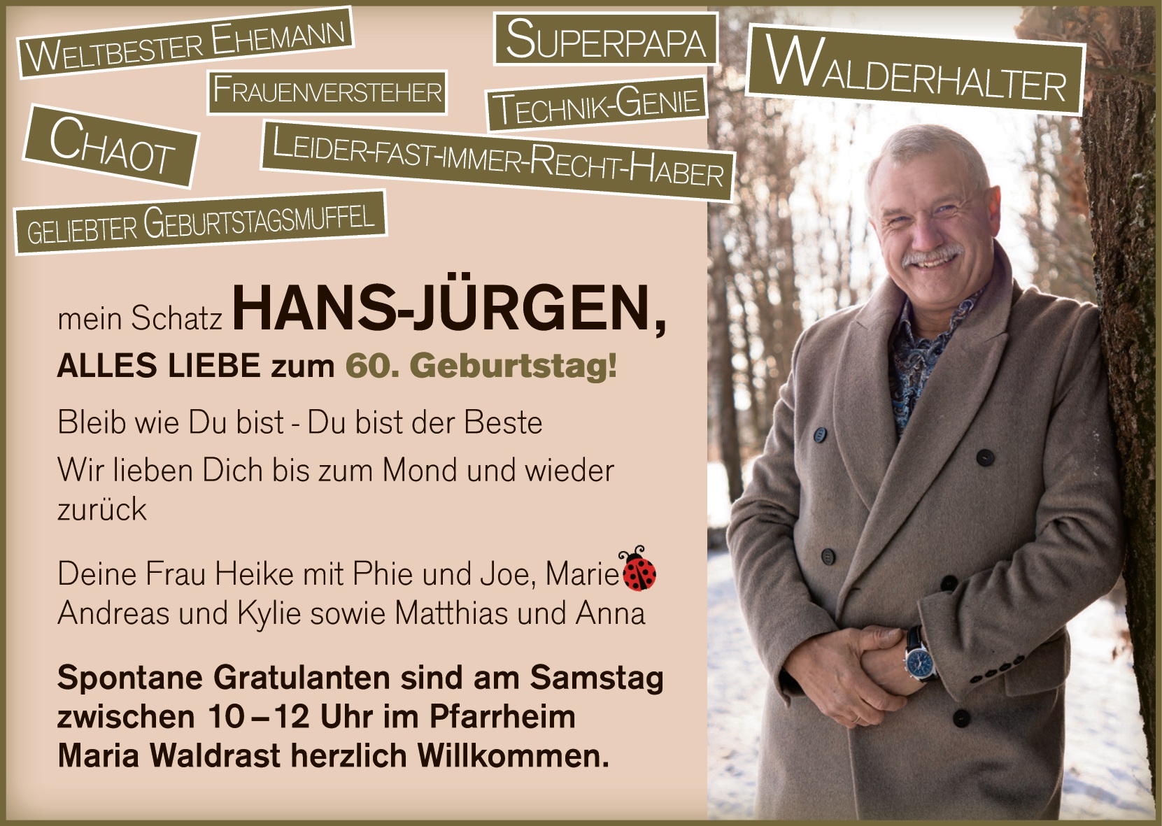 Weltbester Ehemann, Chaot, Frauenversteher, Superpapa, Leider-fast-immer-Recht-Haber, Technik-Genie, Teilzeitgrantler, Walderhalter, geliebter Geburtstagsmuffel, mein Schatz HANS-JÜRGEN,