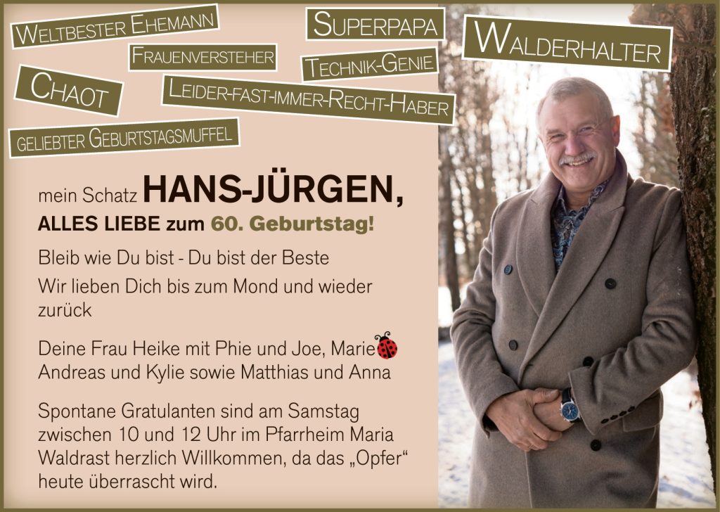 Spontane Gratulanten sind am Samstag zwischen 10 und 12 Uhr im Pfarrheim Maria Waldrast herzlich Willkommen, da das „Opfer“ heute überrascht wird.