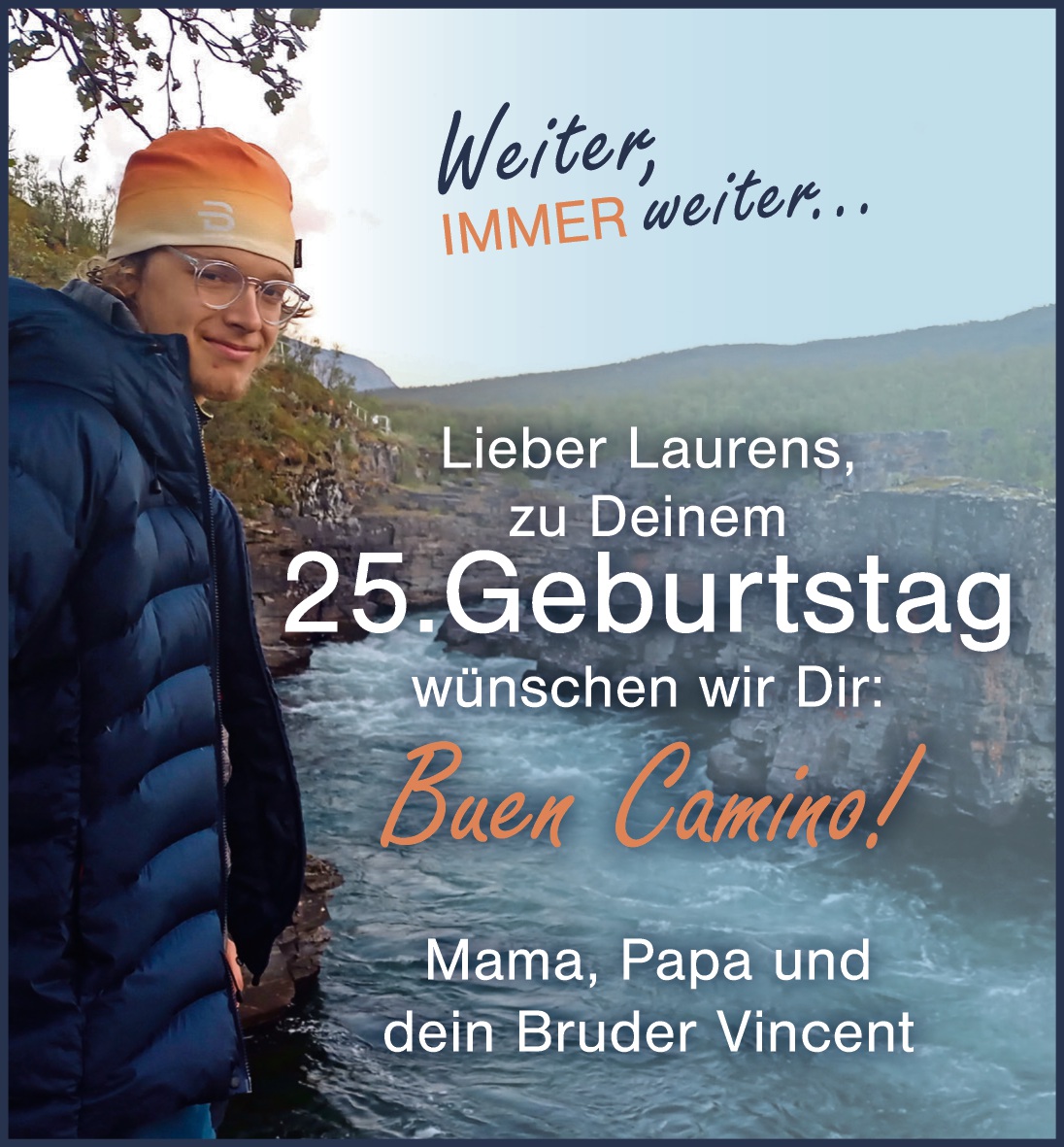 zurück zur Übersicht Veröffentlicht am 11.02.2026 Lieber Laurens,zu Deinem 25.Geburtstag wünschen wir dir: Buen Camino! Mama, Papa und dein Bruder Vincent