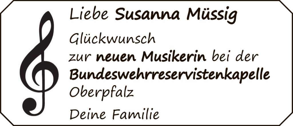 zurück zur Übersicht Veröffentlicht am 24.04.2026 Liebe Susanna MüssigGlückwunsch zur neuen Musikerin bei der Bundeswehrreservistenkapelle Oberpfalz Deine Familie