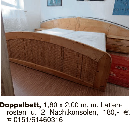 Neuwertiges Jugendbett, helles Holz mit Nachtkästchen, 1,80×2 m, inkl. Lattenrost und Matratze, sehr gut erhalten, bei Selbstabh. AM 140,-Euro Tel. 09621/63362 oder 0176/61410181