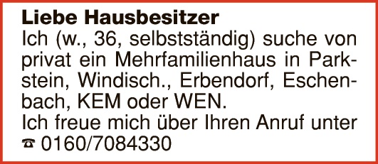 Gesucht im Raum AM-WEN, EFH /MFH für Familie, bis Euro 500.000, keine Kosten für Verk. Immobilien Tel. 0175 1600529