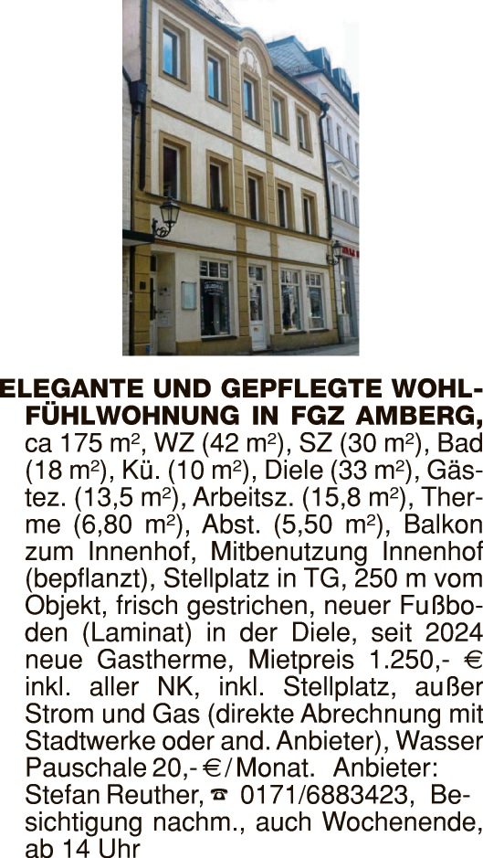3-Zi.-Whg., Altstadt Abg., mit Balkon, 1. Stock, ZH, ca. 90 m², zu verm. Zuschr. Nr. AZ49031Z an Amberger Ztg., Mühlgasse 2, 92224 Amberg oder onetz.de/chiffre