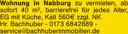 2-Zi.-Wohnung, 40 m², EBK, Stellplatz, Keller, EG, Amberg /Nähe Krankenhaus, zu vermieten. Tel. 0160/6156278
