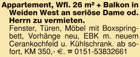 VOH: 2-Zimmer-Wohnung 1.OG, Süd-West-Balkon, EBK vorh., Bad, 63 m², ab 01.06.2026 zu vermieten, KfW 70, Fernwärme, Fahrstuhl + Keller, KM 570,-Euro + NK 160,-Euro. Zuschr. Nr. W49479Z an Der neue Tag, Weigelstraße 16, 92637 Weiden oder onetz.de/chiffre