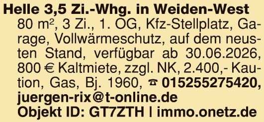 Weiden, schönes, sonniges Apartment , 38 m², mit zusätzlichem kleinen Raum, ca. 8 m², im Dachgeschoß innerhalb der Wohnung über Treppe nutzbar. Bad m. Dusche, Wanne und WC, West-Balkon, 2. Stock, Aufzug, Keller, Stellplatz, auch teilmöbliert möglich gg. Ablöse von Vormieter. An Nichtraucher/in längerfristig zu vermieten ab April/Mai 2026. Whg. 340 Euro + NK 110 Euro + Stellplatz 30 Euro. Kaution 3 MM. Tel. 0176/27637255 ab 19.00 Uhr.