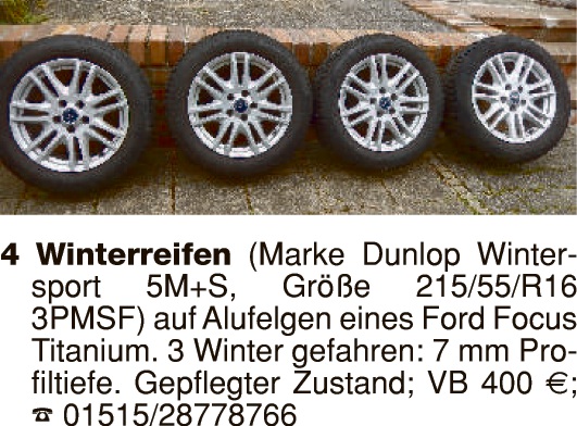 4 gebr. Wi.reifen m. Felgen, zu verk., 4 mm Profil, Reifengr. 195/65 R 15 91 T, Preis, 150,- Euro. Tel. 09621/61273