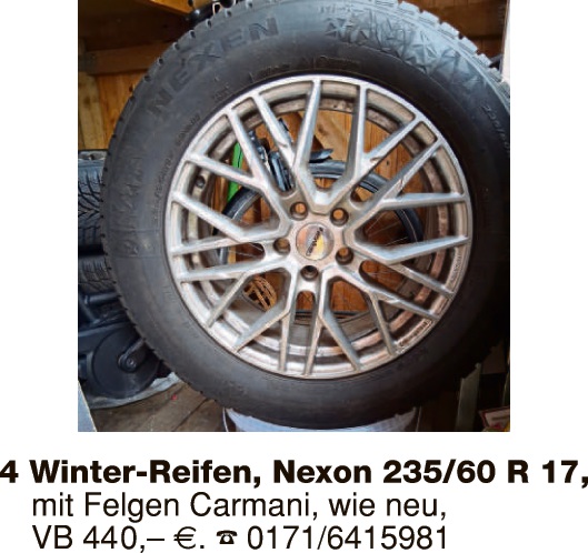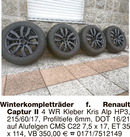 17.12.2025 | Bereifung | Reifen ab 18 Zoll 4 WR m. Stahlfelg. f. BMW i3, Michellin Alpin 155/70 R 19, 2 J. alt, 6 mm Profil, VB 120,- Euro. Tel. 09628/8592 Anzeigen