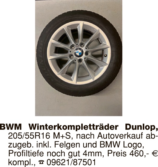 4 WR m. Alufelgen, 205/55 R 16 H, für BMW, neuwertig, 250,- Euro. Tel. 09621/87947