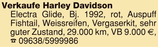 21.02.2026 | KFZ & Zweiräder | Motorräder Yamaha XJ 900, 42.000 km, 2x Seitenkoffer, sehr gepfl., VB 2.600,- Euro. Tel. 0155/60007602, ab 13 Uhr Anzeigen