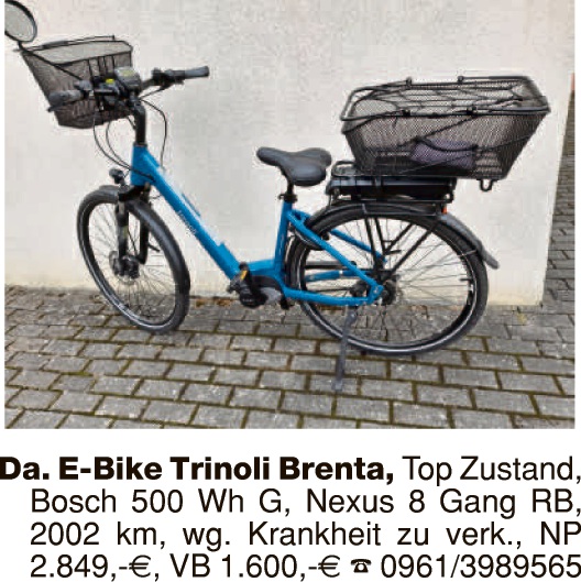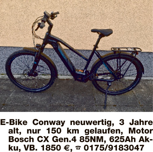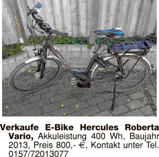 E-Bike „Vikoria“, sehr gepfl. Zustand, 500 Akku, Bosch-Motor, 3.600 km gefahren, VB ca. 900,-. Tel. 01514/1693019