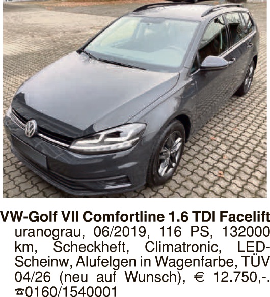 10.12.2025 | KFZ & Zweiräder | VW Golf VI, 1197 ccm, 63 kW/85 PS, graumet., 160 TKM, Benziner, Euro 5, TÜV 12/26, Klima, Sitze Stoff/Leder, Parkkontr., eFH, eASP, ZV, Radio, KD u. Steuerkette neu, 8fach ber., 5.650,- Euro. Tel. 0171/8149623 Anzeigen