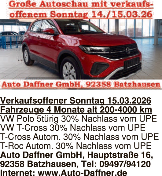 14.03.2026 | KFZ & Zweiräder | VW VW Tiguan 4×4 , EZ 07/2017, PS/Kw 110150, Hubraum 2.0 ccm³, Km-Stand 145.500, Ausstattung: Alufelgen, Navi, Allradantrieb, Automatic, Sitzheizung, get. Scheiben, Klimaautomatic, Tempomat, 4x el. FH, BC, Parkpilot hi+vo, Xenon, Radio/Telefon, NSW. Euro 17.990,-Tel. 09634/458 Autohaus Strobl GmbH, Wiesau Anzeigen