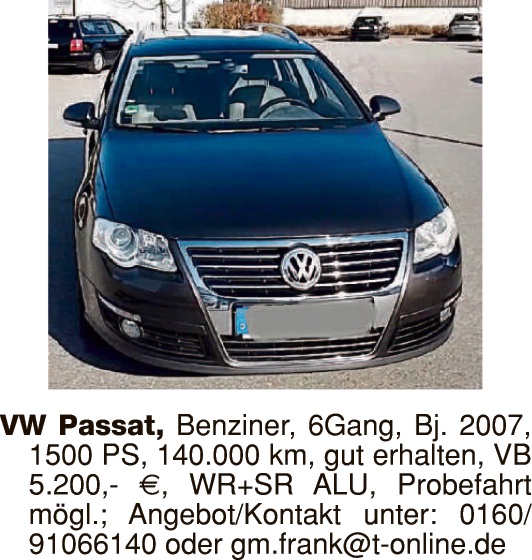 18.03.2026 | KFZ & Zweiräder | VW Passat 2.0 TDI, EZ 10/2010, 140 PS, 267.000 km, HU bis 03/2028, KD-Heft, AHK, antrazith-met., VB 2.950,-. Tel. 09431/43654 oder 0176/43450544 Anzeigen