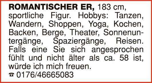 Ich, 62 J., schlank, aufgeschlossen, ehrlich, suche netten, attraktiven Partner für alles Schöne und was gemeinsam Spaß macht (Tanzen, Wandern, Wellnessen) freu mich auf eine Nachricht von dir Zuschr. Nr. W49145Z an Der neue Tag, Weigelstraße 16, 92637 Weiden oder onetz.de/chiffre