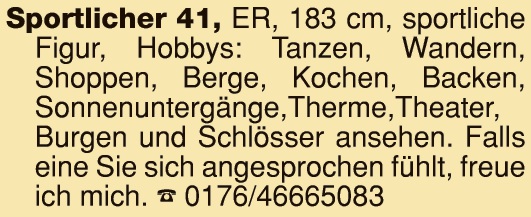 Er, 44 Jahre, schlank, sportlich, unternehmenslustig, sucht passende schlanke, sportliche Frau für den gemeinsamen Lebensweg mit Interesse an Landwirtschaft, ohne Kinder, Raum WEN/TIR. Tel. 0151/40114844 mit WhatsApp