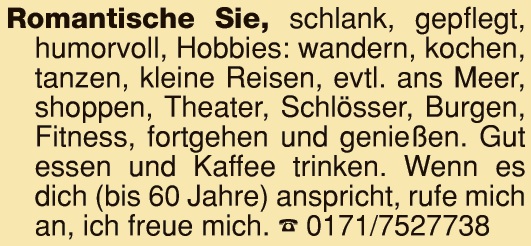 Suche netten älteren größeren Herren , WEN od. näh. Umgeb., für gemeins. Unternehmungen, kl. Wanderungen, Fahrten u. Ausflüge, bin Witwe, 165 groß, schlanke Figur, liebe die Natur, bin unternehmungsfreudig. Zuschr. Nr. W49482A an Der neue Tag, Weigelstraße 16, 92637 Weiden oder onetz.de/chiffre