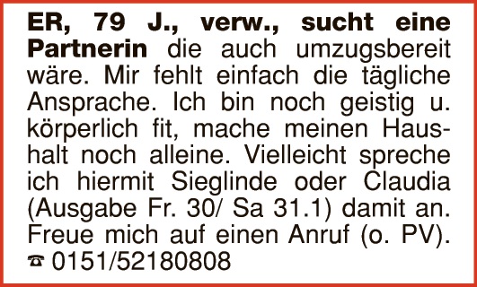 Rüstiger 74 jähriger, 177, schlank, hat das Alleinsein satt. Ortsgeb., handwerkl. begabt, su. dich zw. 63 und 70 J., häusl., f. kl. Unternehmungen, evtl. auch gemeins. Lebensabend. Freue mich auf deinen Anruf. Tel. 0171/5676529