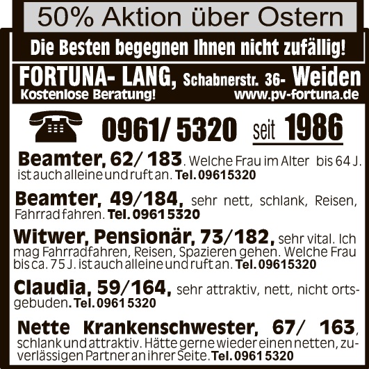 Sie, 52, sehe gut aus, 1,70 m, schlank, treu, ehrlich, liebevoll, familiär, NR, keine Kinder, sucht attraktiven, seriösen u. sportl. Mann, 49 bis 56 J., NR, mind. 1,80 m, für feste Partnerschaft, mit Bild wäre nett. Zuschr. unt. Nr. AZ49496A an Amberger Ztg., Mühlgasse 2, 92224 Amberg oder onetz.de/chiffre