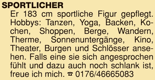 Schön wird das Leben erst zu zweit: Egal, ob Sie auf der Suche nach einem Gleichgesinnten für die Freizeitgestaltung sind oder als Single die Liebe des Lebens finden wollen – in unserer Rubrik „Partner & Freizeit“ bieten nicht nur professionelle Partnervermittlungen ihre Hilfe bei der Partnersuche an. Mit „Er sucht Sie“ und „Sie sucht Ihn“ möchten Frauen und Männer aus der Region ihr privates Glück finden.