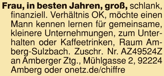 Sie, 70+, su. netten schlanken Herrn im Raum Amberg/Sulzbach. Zuschr. Nr. AZ49541Z an Amberger Ztg., Mühlgasse 2, 92224 Amberg oder onetz.de/chiffre