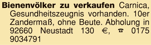 Verkaufe 5 Bienenvölker Carnica, mit Gesundheitszeugnis. Tel. 09602/8188