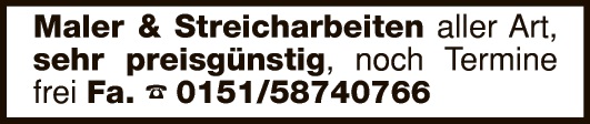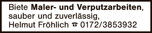 Gelernter Maler erledigt ihre Maler- und Lackierarbeiten, sowie kleinere Verputzarbeiten. Telefon 0170 | 8191245