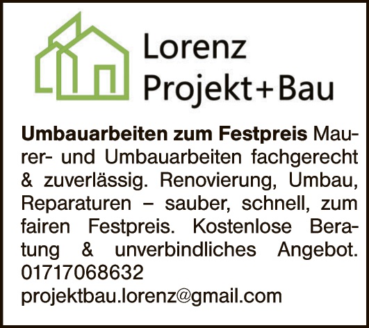 Bauunternehmen, Meisterbetrieb, übernimmt Neubau-, Umbau-, Renovierungs-, Maler-, Fliesenleger- u. Bodenbelagsarbeiten, auch kleine Aufträge, sehr preisgünstig. Tel. 0151/57004087